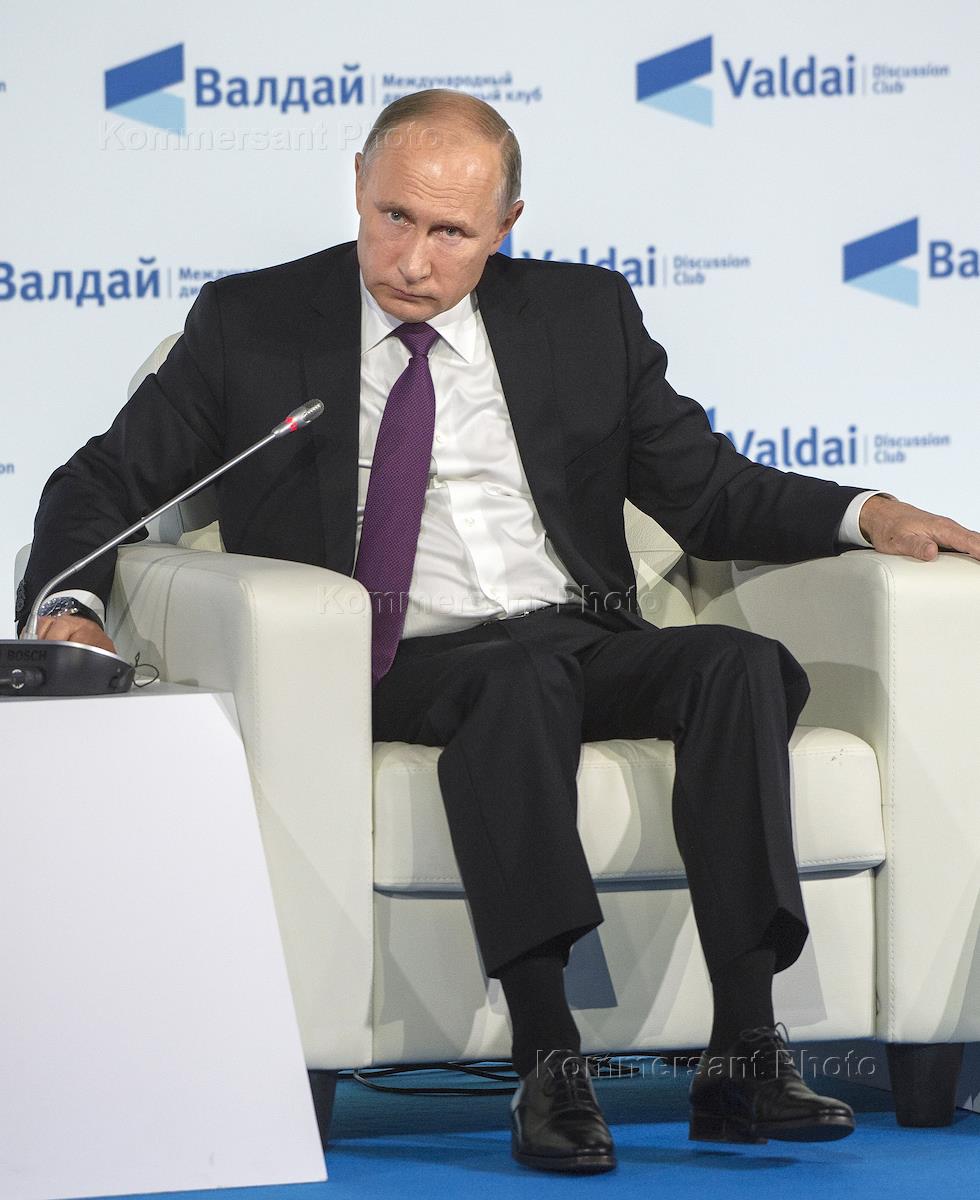 Рабачая поездка президента России Владимира Путина в Сочи. XIV ежегодное заседание Международного дискуссионного клуба "Валдай" под названием "Мир будущего: через столкновение к гармонии". Президент России Владимир Путин во время итоговой пленарной сессии.
