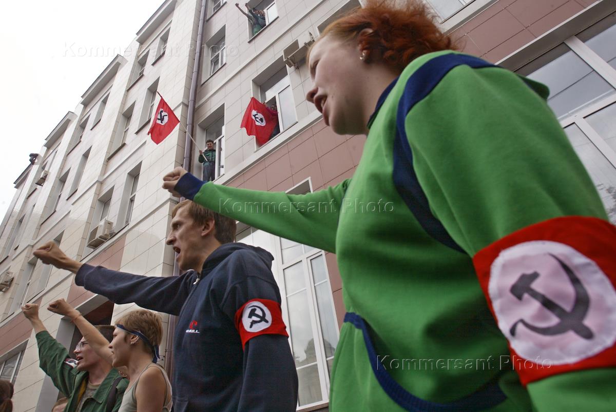 Захват активистами партии Национал-большевистской (нацбол) партии здания Министерства здравоохранения России. Таким образом нацболы решили выразить свой протест по поводу законопроекта об отмене льгот. Участник захвата топчет ногами, выброшенный из разбитого окна здания министерства, портрет Президента России Владимира Путина.