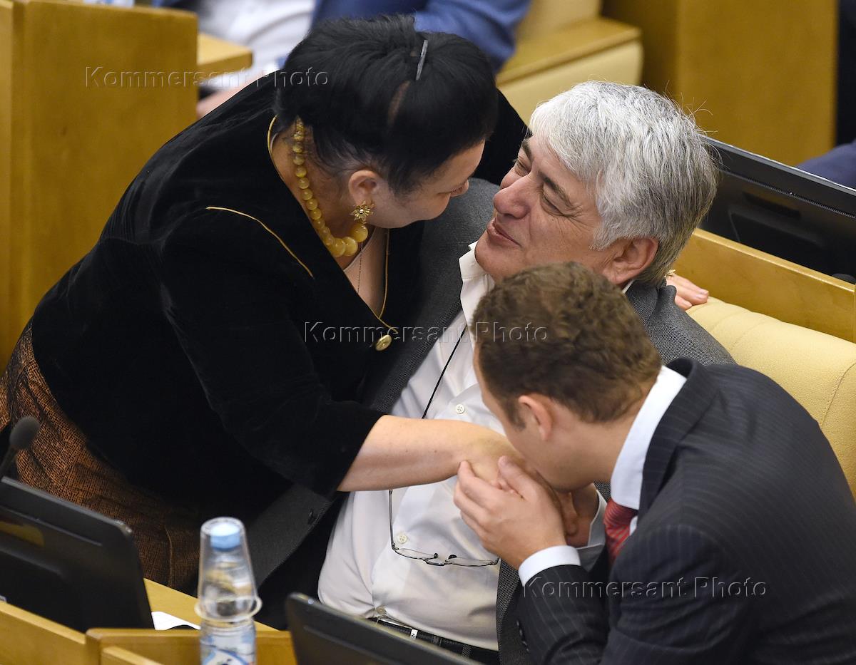Пленарное заседание Государственной думы (ГД) России. Член комитета ГД России по государственному строительству и законодательству Отари Аршба (в центре) и член Комитета ГД по бюджету и налогам Раиса Кармазина (слева) перед началом заседания.
