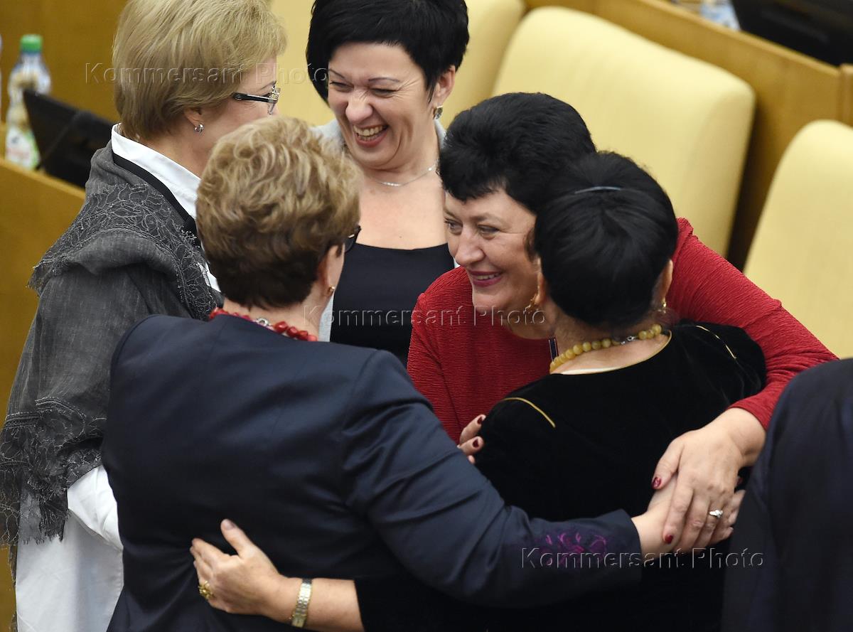 Пленарное заседание Государственной думы (ГД) России. Член комитета ГД по культуре Ольга Германова (вторая справа), член комитета ГД по вопросам семьи, женщин и детей Валентина Миронова (третья слева) и член Комитета ГД по бюджету и налогам Раиса Кармазина (справа) перед началом заседания.