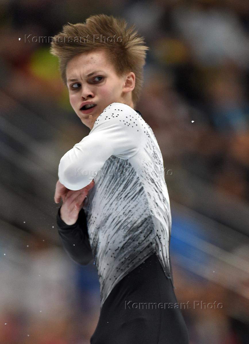 ISU Гран-при "Кубок Ростелеком" - 2017 по фигурному катанию во Дворце спорта "Мегаспорт". День первый. Фигурист Денис Василевс (Латвия) во время выступления на I этапе в короткой программе мужского одиночного катания.