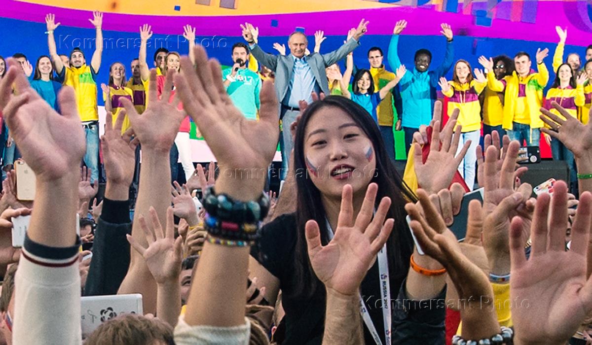 XIX Всемирный фестиваль молодежи и студентов в Сочи. День седьмой. Участники фестиваля во время выступления президента России Владимира Путина (на экране) на шоу "Россия".