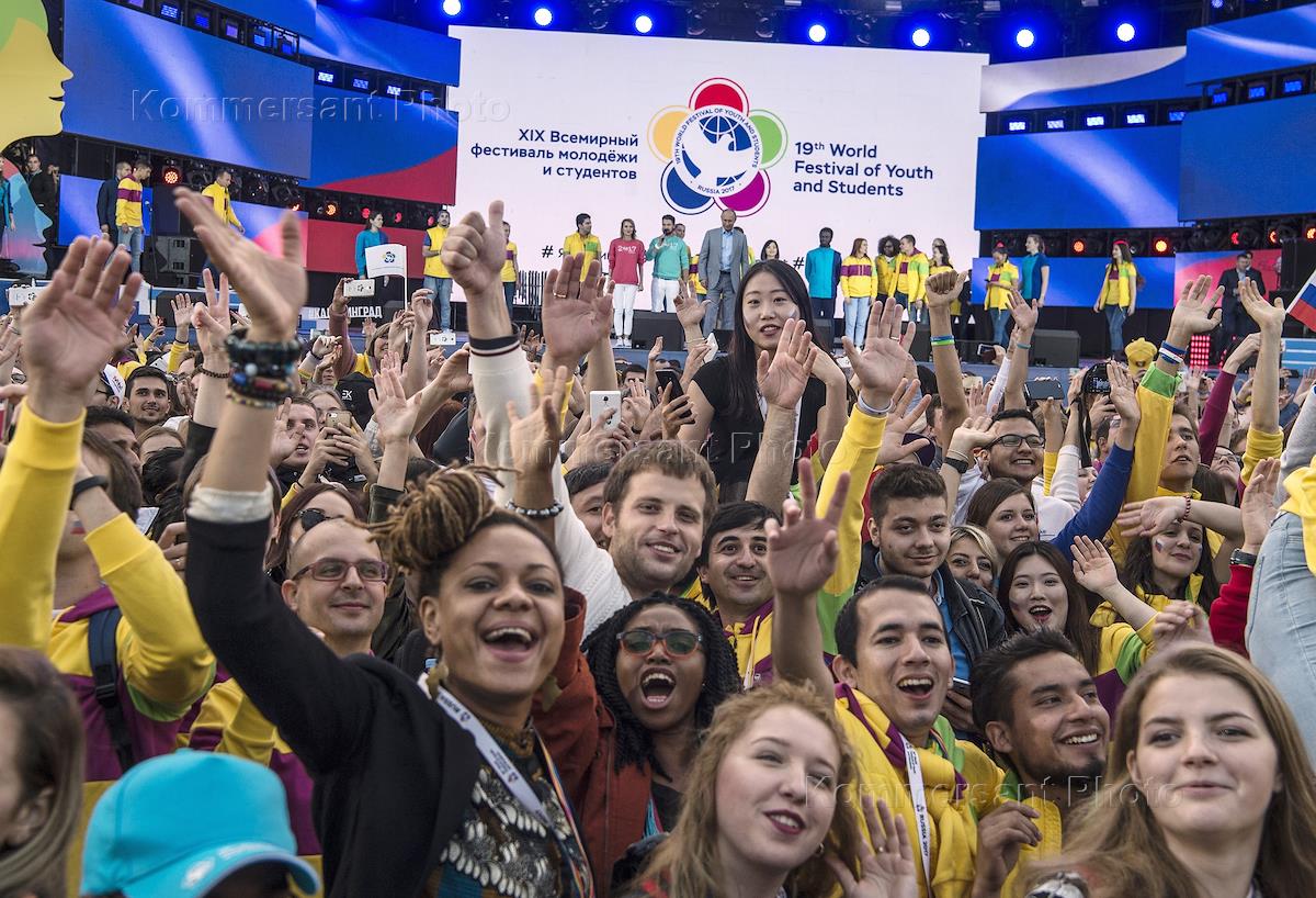 XIX Всемирный фестиваль молодежи и студентов. Участники фестиваля во время шоу "Россия" в Олимпийском парке.