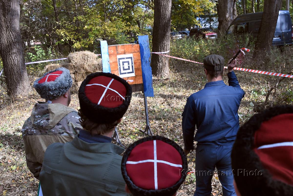 Турнир по казачьему многоборью на Кубок Атамана "Покровский этап" прошел в сквере Дворца культуры профсоюзов. Соревнования по метанию ножей.