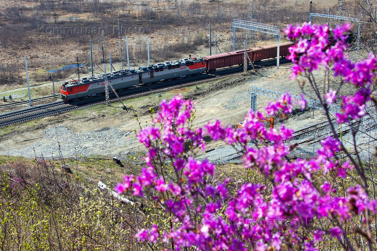 Жанровая фотография. Грузовой состав с лесом и локомотив ВЛ80 на путях вокзала города Борзя.