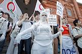 Театрализованная акция протеста против принятия Государственной Думой России законопроекта о монетизации льгот. Участницы акции в медицинских бинтах и с лозунгом "Таким ты станешь после отмены льгот!". Акцию организовали представители Российской демократической партии "Яблоко" у здания Исторического музея.