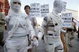 Театрализованная акция протеста против принятия Государственной Думой России законопроекта о монетизации льгот. Участники акции в медицинских бинтах и с лозунгом "Нет отмене социальных льгот!". Акцию организовали представители Российской демократической партии "Яблоко" у здания Исторического музея.