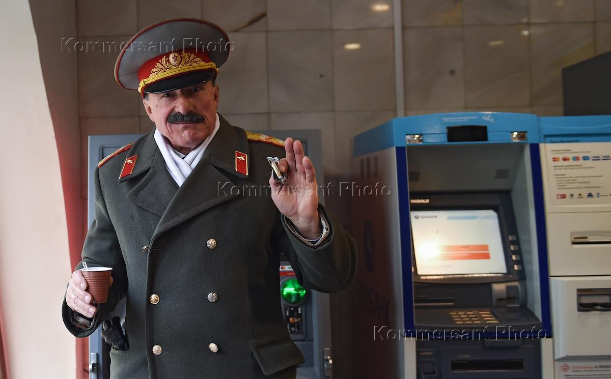 Жанровая фотография. Мужчина в военной форме с чаем и конфетой в помещение с банкоматами.