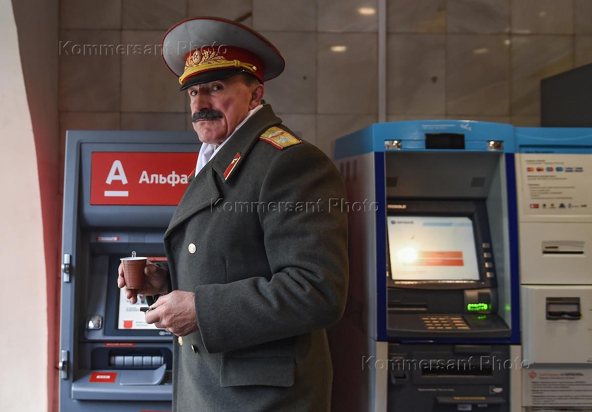 Жанровая фотография. Мужчина в военной форме снимает деньги в банкомате.