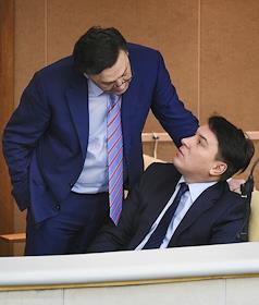 Дополнительное заседание Государственной думы (ГД) России. Председатель комитета ГД по труду, социальной политике и делам ветеранов Андрей Исаев (слева) и председатель комитета ГД по бюджету и налогам Андрей Макаров (справа) перед началом заседания.
