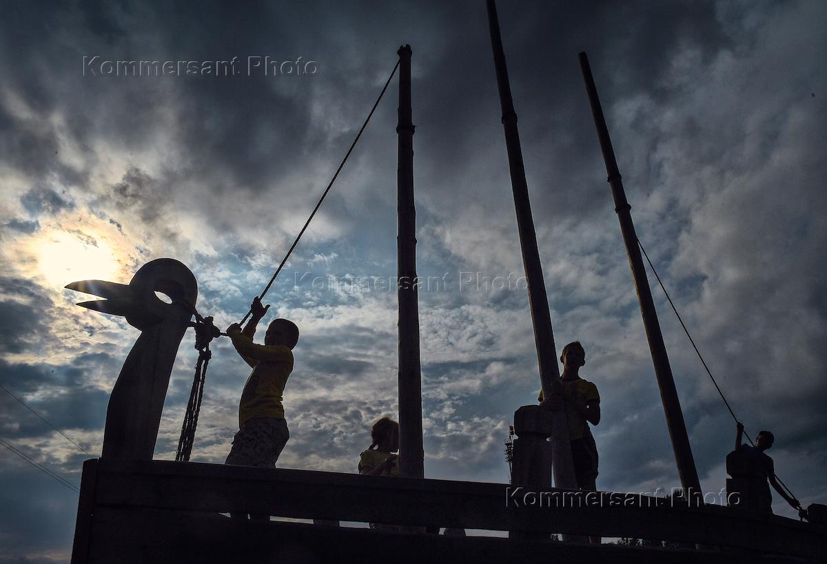 Кенозерский национальный парк. ФГБУ "Национальный парк "Кеноозерский". Дети на деревянном основании лодки во время заката.
