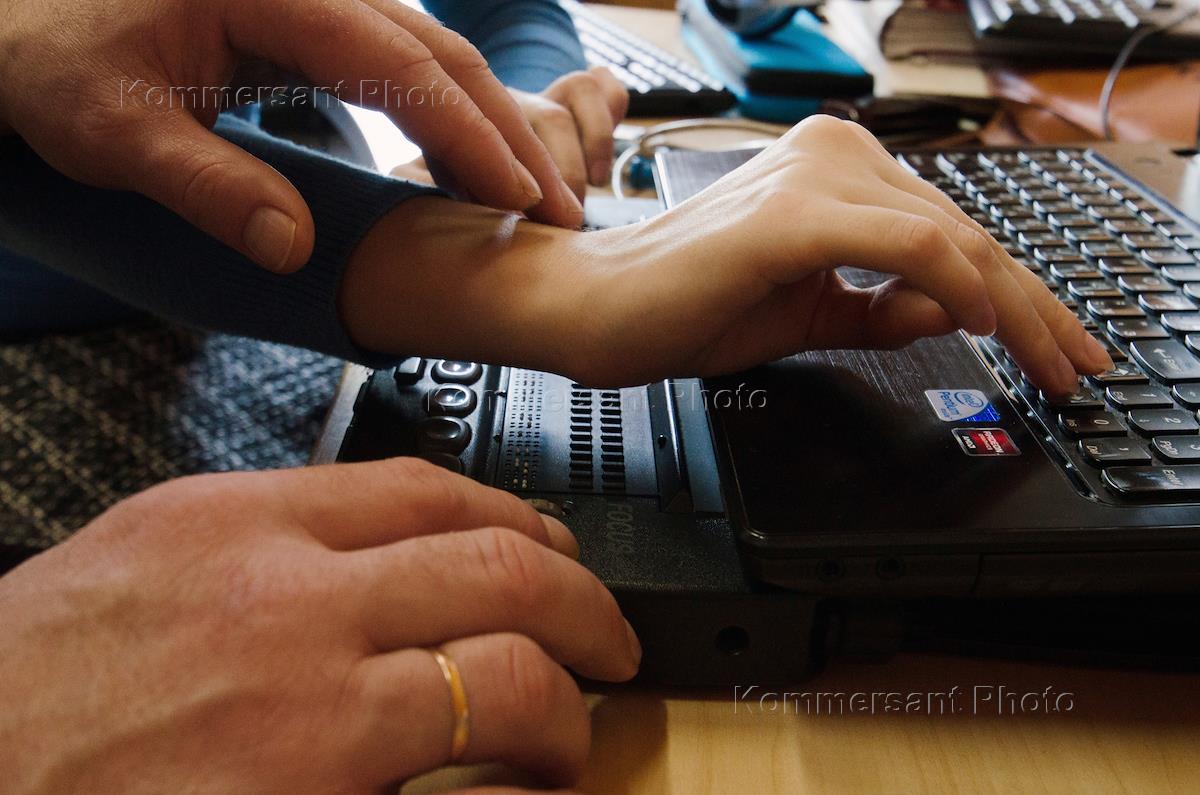 Фотопроект "Команда B1". Социально активные, незрячие молодые люди. Слепоглухой ученик Евгении Лагуниной держит ее руку, чтобы понять последовательность действий при работе с внешними носителями компьютера. К компьютеру подсоединена специальная клавиатура с шрифтом Брайля.