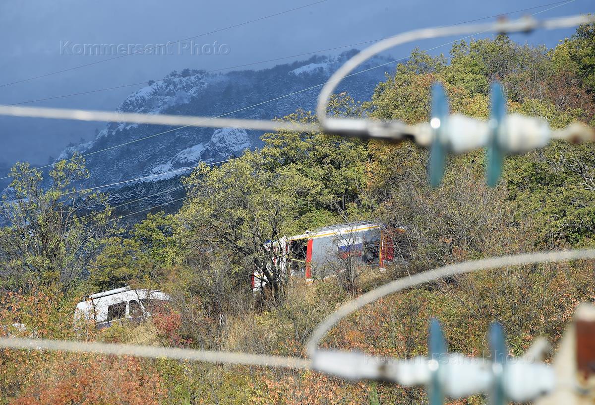 Взрыв газопровода на Южном берегу Крыма. Опоры ЛЭП в районе взрыва газопровода. Автомобиль Следственного комитета России в районе взрыва.