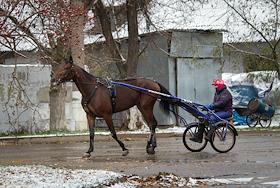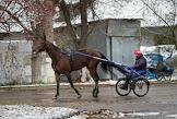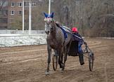 Центральный Московский ипподром. Лошадь, запряженная в специальный экипаж, предназначенный для бегов, с наездником во время тренировки.