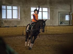Центральный Московский ипподром. Тренировка по выездке лошади в манеже.