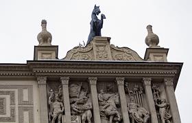 Центральный Московский ипподром. Скульптурные изображения коней на крыше здания ипподрома.