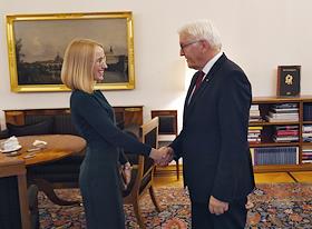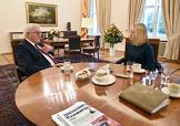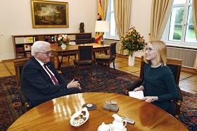 Президент ФРГ Франк-Вальтер Штайнмайер (слева) и обозреватель газеты "Коммерсантъ" Галина Дудина (справа) во время интервью.