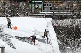 Жанровая фотография. Уборка снега с крыши жилого дома. Сотрудники коммунальной службы города на…
