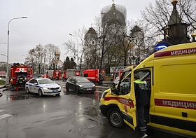 Последствия пожара в строящемся пятиэтажном здании на Соймоновском проезде. Автомобили реанимации и…