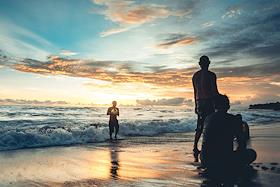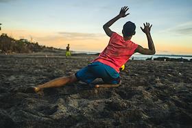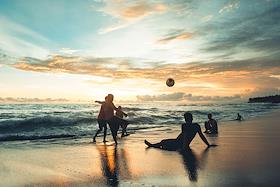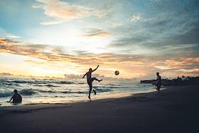 Местные жители играют в пляжный футбол на берегу Индийского океана.