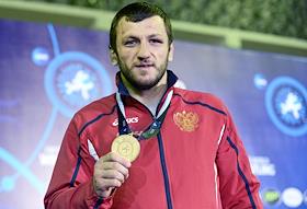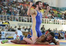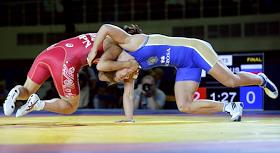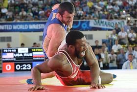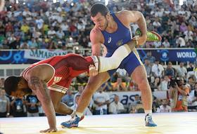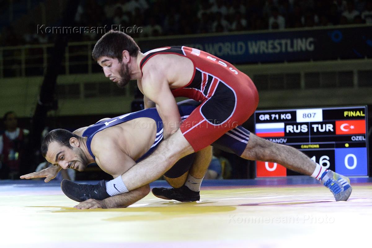 Чемпионат мира по борьбе 2014. Борец греко-римского стиля Чингиз Лабазанов (в красном костюме).