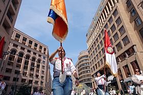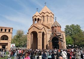 Шествие скаутов по улицам Еревана. Армянские национальные танцы возле церкви Св. Анны в Ереване в…