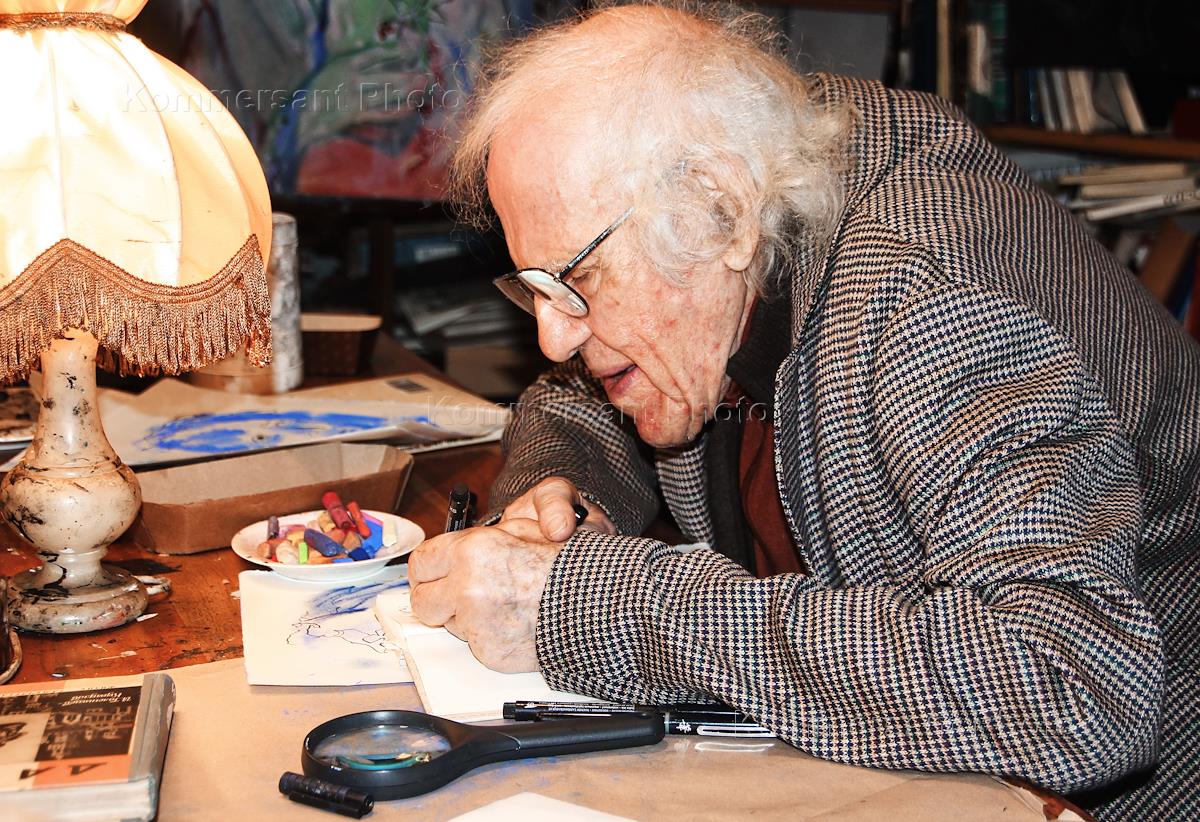 Художник Александр Траугот в своей мастерской.