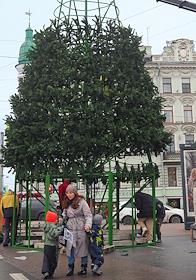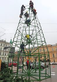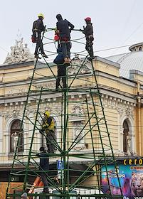 Подготовка к празднованию Нового года в городе. Установка и монтаж искусственной новогодней елки на…