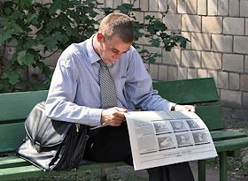 Подборка. Фото из архива. Человек с портфелем сидит на скамейке и читает газету "Коммерсантъ".