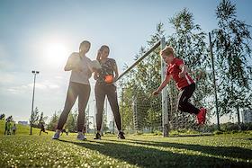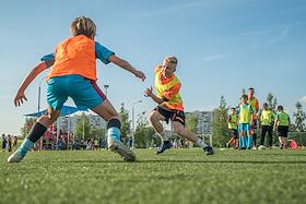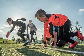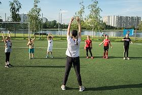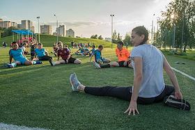 Спортивные тренировки на футбольном поле в Братеевском каскадном парке, на берегу Москва-реки.