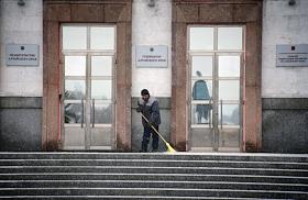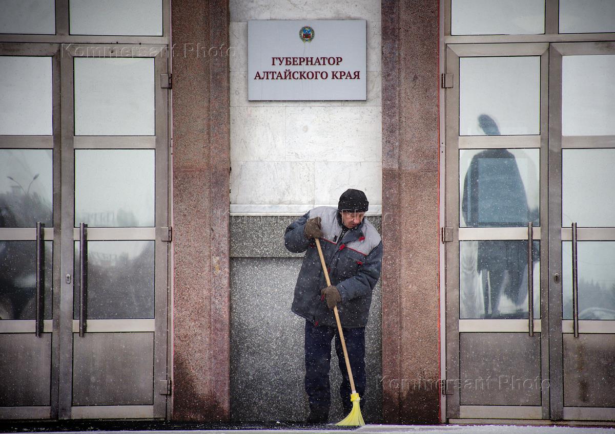 Дворник во время уборки снега у здания правительства и резиденции губернатора Алтайского края.