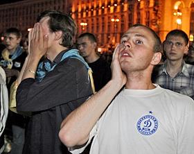 Фанаты украинской сборной по футболу на площади Независимости в Киеве во время матча Украины с…