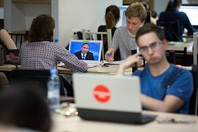 Посетители библиотеки Томского государственного университета смотрят прямую линию с Президентом РФ…