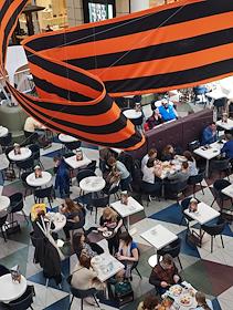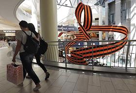 Упаковка зелёного лука с Георгиевскими ленточками и надписью "С Днём Победы!"