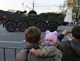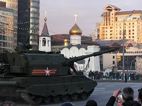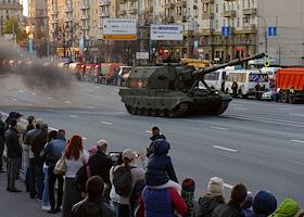 Прохождение боевой техники у Белорусского вокзала на тренировку парада на Красной площади.