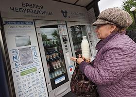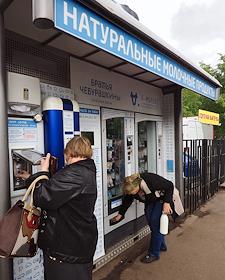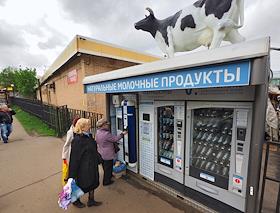 Аппарат для продажи молочной продукции Семейной фермы Братья Чебурашкины на Коптевском рынке.