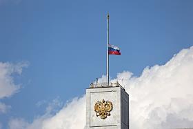 Приспущенный в честь дня памяти и скорби флаг России над Домом правительства Российской Федерации.
