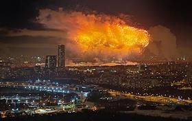 Люди наблюдают Фейерверк с высоты 45 этажа, крыша ЖК Эдельвейс. Вид на город.