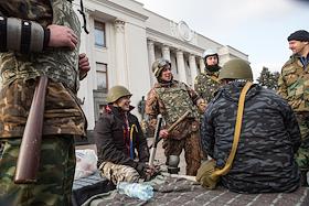 Евромайдан. Траурные мероприятия в Киеве. Майдан. Бойцы cамообороны охраняют вход в здание Верховной…