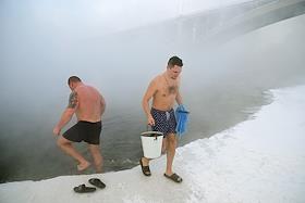 Участники клуба закаливания и зимнего плавания "Криофил" во время крещенских купаний на берегу реки…