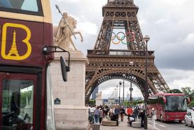 Жанровая фотография. Эйфелева башня с символом летних Олимпийских игр 2024 - Олимпийскими кольцами.