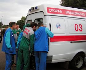 Сотрудники скорой помощи заглядывают в машину скорой помощи. Жанровая фотография