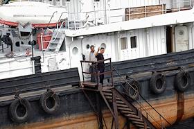 Мужчина на фоне речного судна на территории уфимского судоремонтного завода