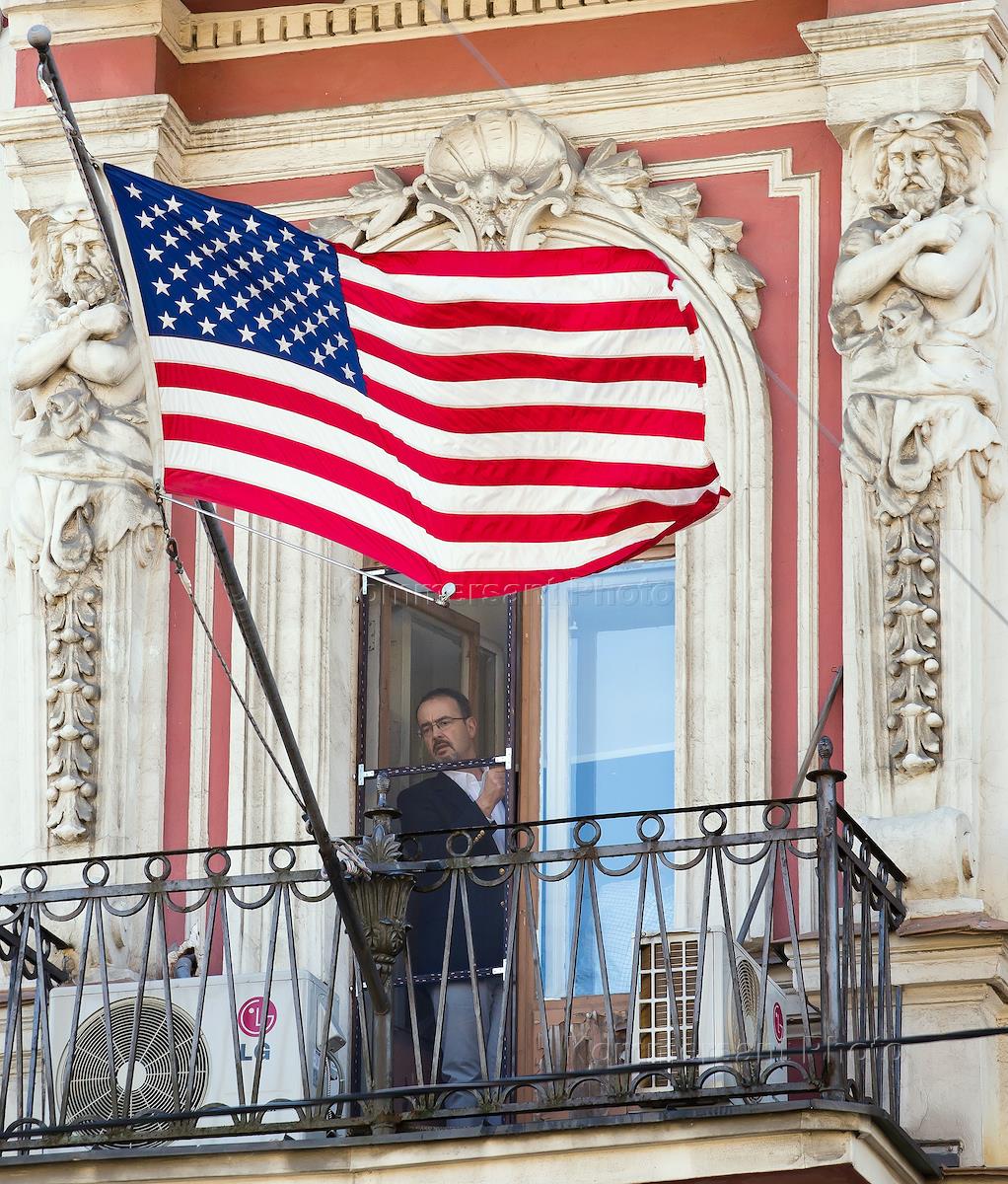 Сотрудники генерального консульства США в Санкт-Петербурге снимают американский флаг с фасада здания