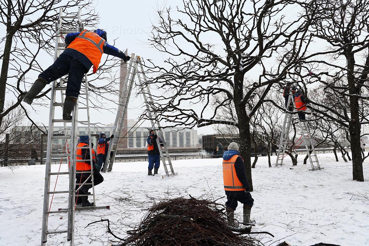 Жанровые фотографии. Обрезка деревьев на площади Победы в Санкт-Петербурге.