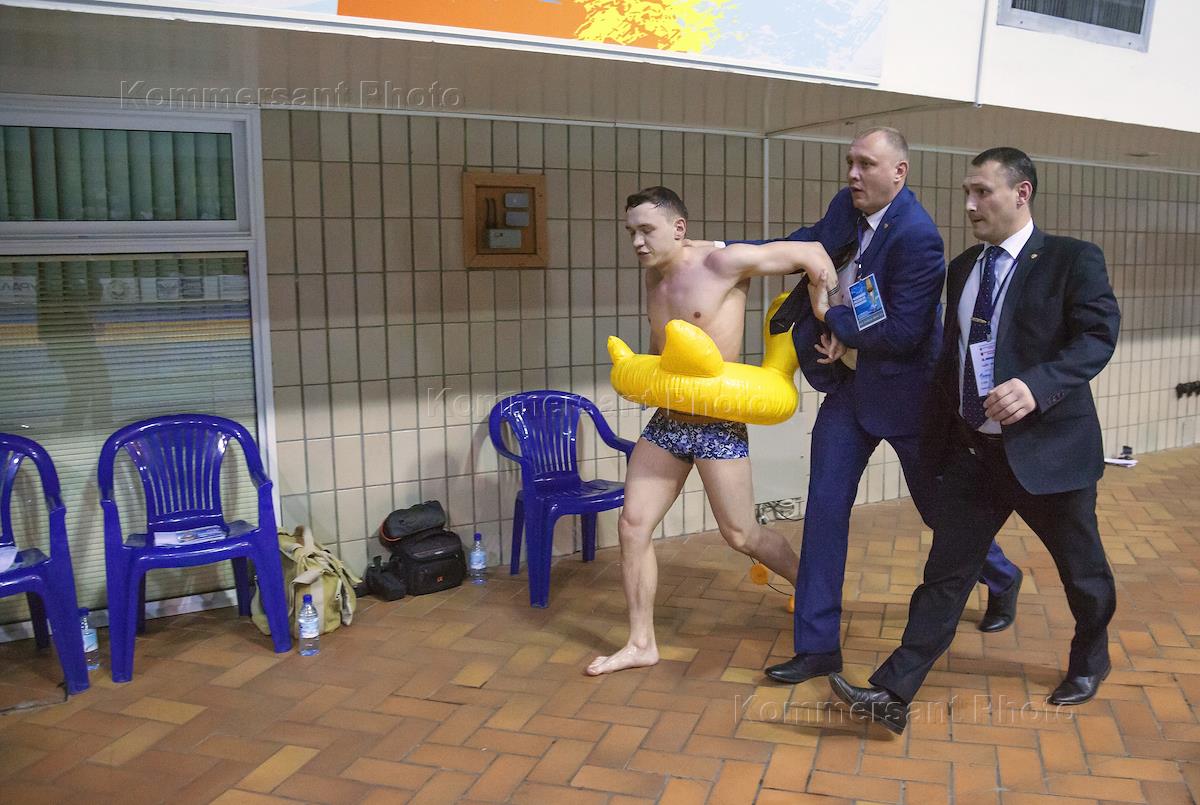 Чемпионат России по плаванию. Хулиган с надувным кругом в форме желтого утенка в плавательном…