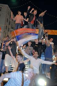 Массовое гулянье болельщиков на улицах города после победы сборной России в четвертьфинальном матче…