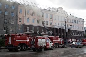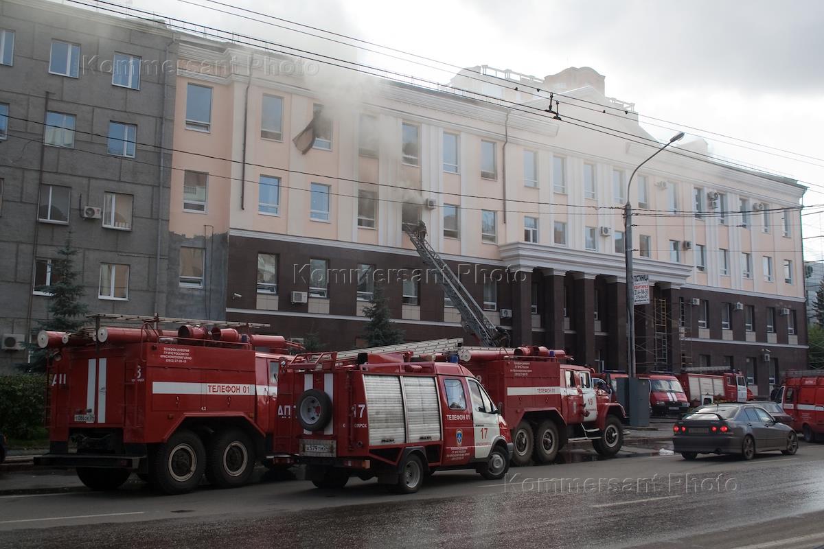 Левое крыло офисного здания ОАО "СУЭК-Красноярск" горит в центре Красноярска.