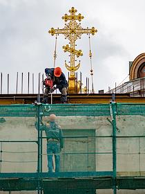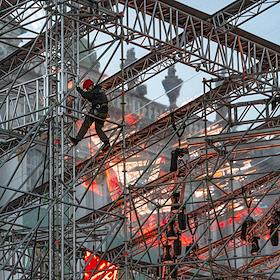Сборка сцены на Дворцовой площади к празднованию Дня города. Установка Люстры.