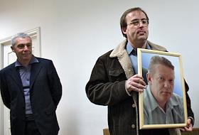 Журналист Сергей Почечуев с портретом депутата Госдумы от Единой России Николая Панкова на заседании…